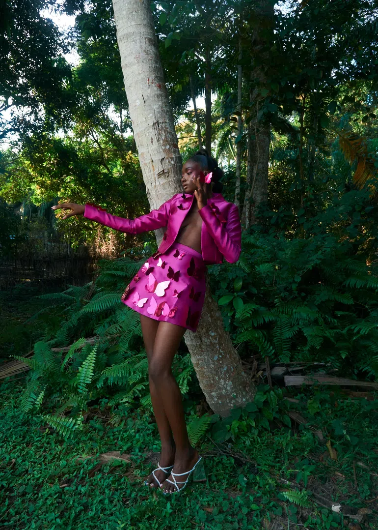 Imad Eduso's latest collection, The Great Escape, is an array of statement pieces designed for the bold, sun-chasing woman. Most of these designs feature sheer textures, butterfly motifs, and shapes that convey freedom, softness, and the luxury of self-expression.