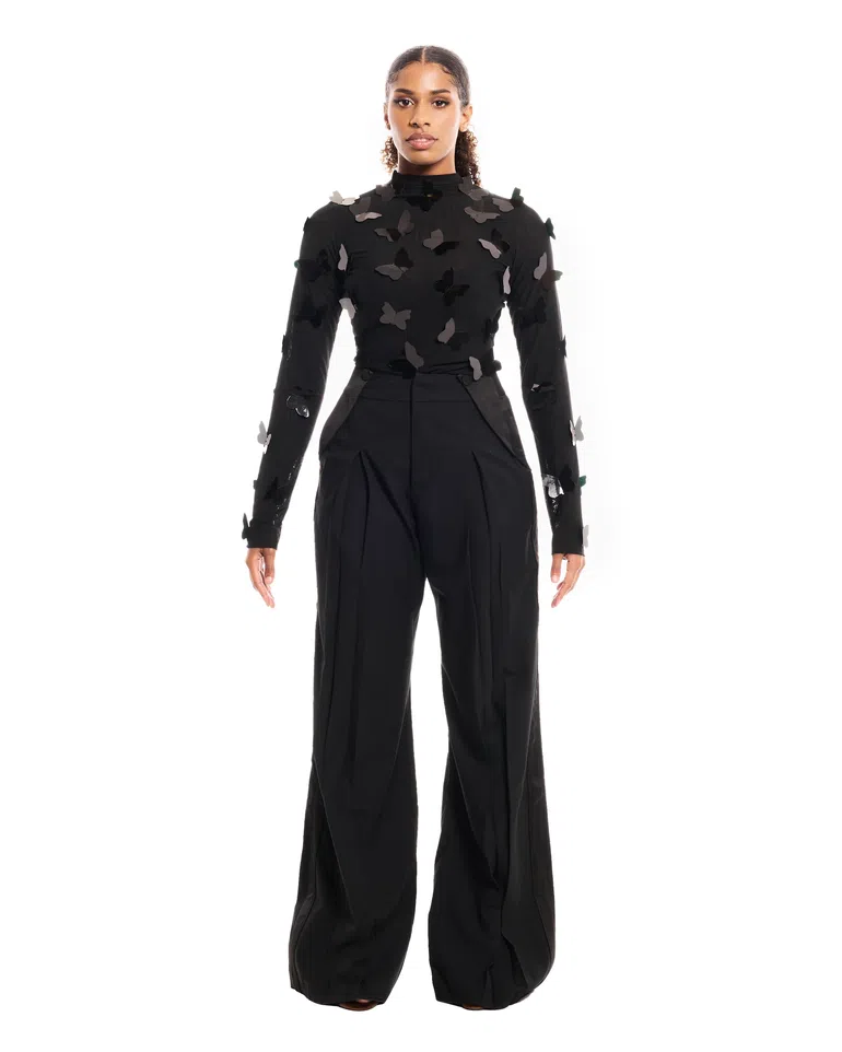 The Labo Top’s tonal butterfly mesh pairs with wide-leg Alaia pants for an all-eyes-on-you entrance. All black, all structure. Sophisticated but not stiff, it’s a power look. Equal parts wearable and dramatic.