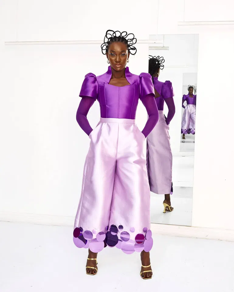 This one is a rich lilac pairing that blends crisp tailoring with playful shine. The structured Abeke corset top balances the flow of the culotte-style Adunni pants, made from silk satin and hand-embellished with custom sequins. Functional enough for movement and styled monochrome for extra shine, this is how you subtly do standout.