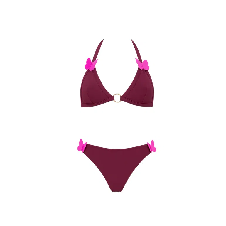 Sculpted in rich wine-toned double-stretch fabric and finished with fluttery hand-appliquéd butterflies, this bikini is part swimwear, part statement. It’s tailored for the poolside or beachfront; the gold ring hardware and quick-dry fabric make it both glamorous and functional. The sculpted fit flatters every curve while still keeping things tasteful.