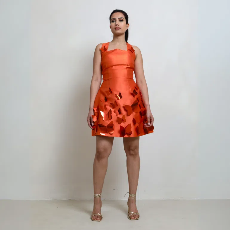 This one is a juicy orange mini peppered dress with hand-sewn butterflies along the shoulders and hem. The Ella is a full-on fashion moment if you can discern well enough. The box neckline and structured bodice elevate it from cute to commanding. It's a look that photographs beautifully from every angle.