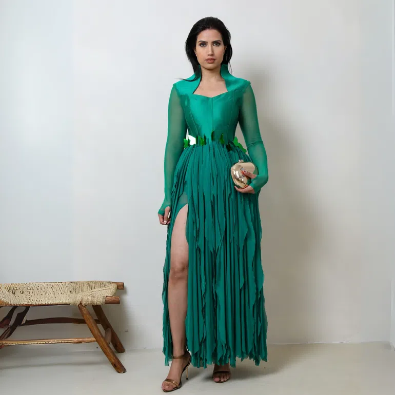 The corseted waist, mesh sleeves, and draped tassel effect of this midi make it a maximalist fashion piece. It’s an excellent green satin stunner that doesn’t come in low-key, but announces itself. If drama is the assignment, Emma delivers.