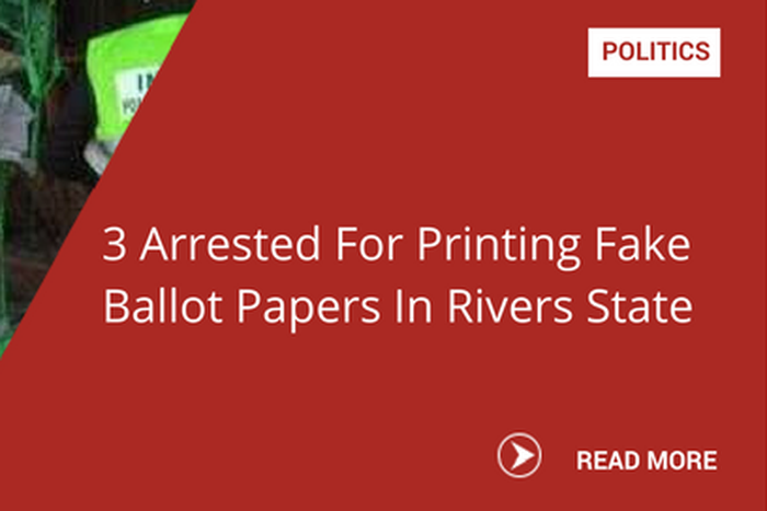 Rivers Police Command said on Sunday that it had arrested three persons for allegedly printing fake ballot papers for the re-run legislative election in the state.