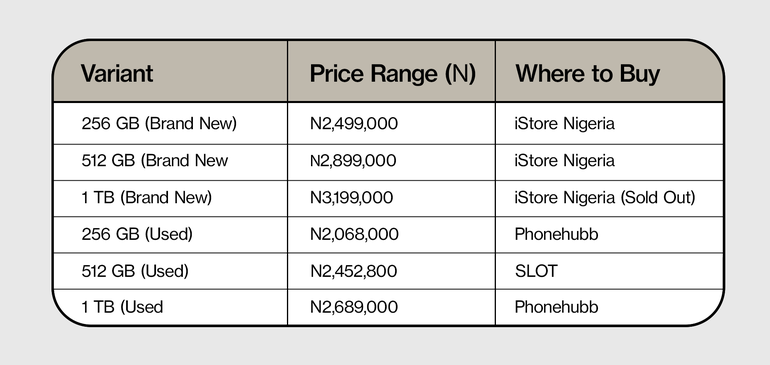 Moving from 256 GB to 512 GB adds approximately ₦400,000, and upgrading to 1 TB is nearly ₦800,000 more.