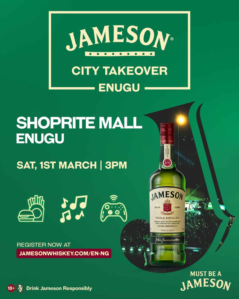 On March 1, 2025, Jameson Irish Whiskey will bring its distinctive City Takeover experience to Enugu at Shoprite Polo Park Mall, offering an evening that blends Enugu's warm heritage with their signature vibrant energy.