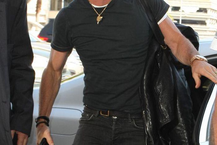 The 44-yr-old newlywed looked cool and casual in an all-black outfit, brown trilby, suede boots and aviators.