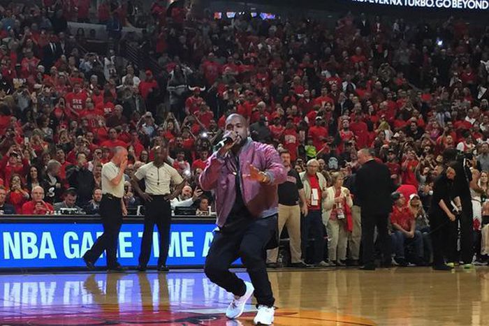 Watch Kanye West deliver another performance of his single, 'All Day', Kanye West has performed his recent single 'All Day' at the Chicago Bulls NBA playoffs game against the Cleveland Cavaliers.Yeezy, who's from Chicago, introduced both teams before the tip-off, and during a first-quarter timeout, jumped back on the court for a rendition the track. According to the Bulls' official Twitter account, the short show was impromptu.'All Day' is expected to feature on Kanye's forthcoming album. Last week he made the surprise announcement that he's changed the name of the LP from 'So Help Me God' to 'SWISH', though has retained the right to change it again if he so desires.