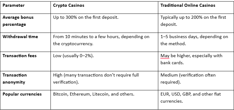 According to Kasinobonus, the average welcome bonus in crypto casinos exceeds similar offers from traditional casinos by 20-30%.