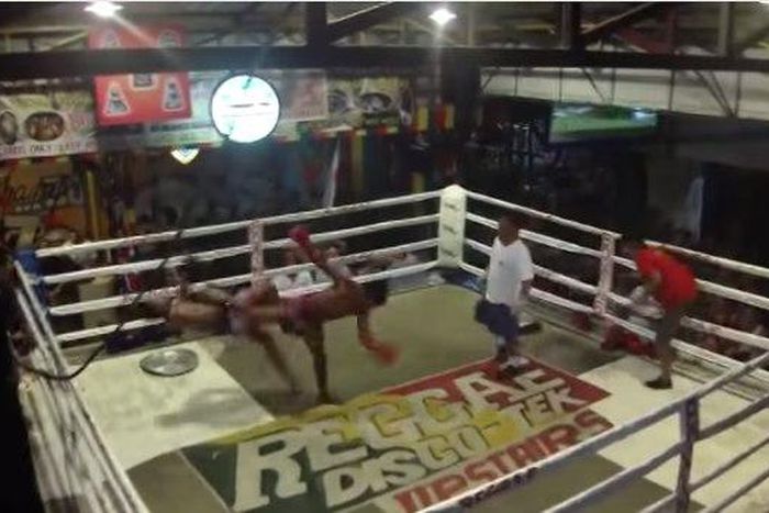 At a bar in Thailand a relatively normal kickboxing fight is unfolding and it looks like an easy win for the man in white shorts.