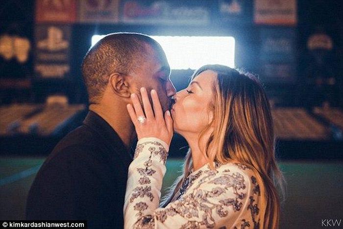 One was of the kiss shared between herself and her husband, Kanye after he got down on one knee in a surprise proposal at a baseball stadium in San Francisco.