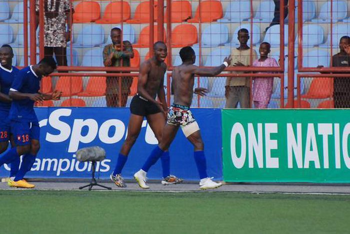 Super Eagles defender, Kunle Odunlami and Prince Agrey both stripped to their pants as they celebrated Prince's last gasp goal against Dolphins in the match day four of the Nigeria Football Professional League.