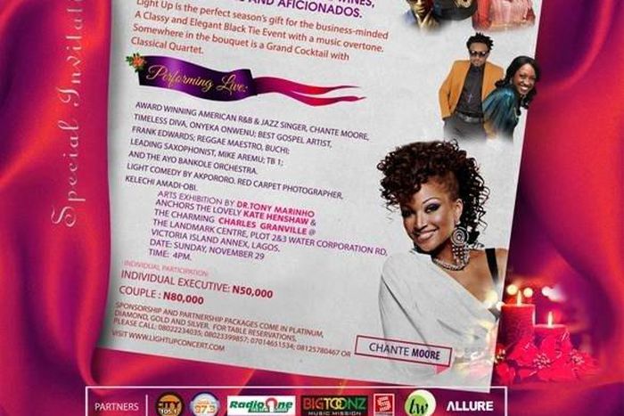 This year's lineup artistes include the Elegant diva, Lady Onyeka Onwenu, Multi-Talented rapper and singer, TB1, Nigeria's Best Gospel Artist, Frank Edwards (aka Rich Boy), Super Star Reggae maestro Buchi, Nigeria's leading saxophonist, Mike Aremu, The Muson Orchestra and award winning American R&B and Jazz singer, song writer and actress, Chante Moore. www.lightupconcert.com
