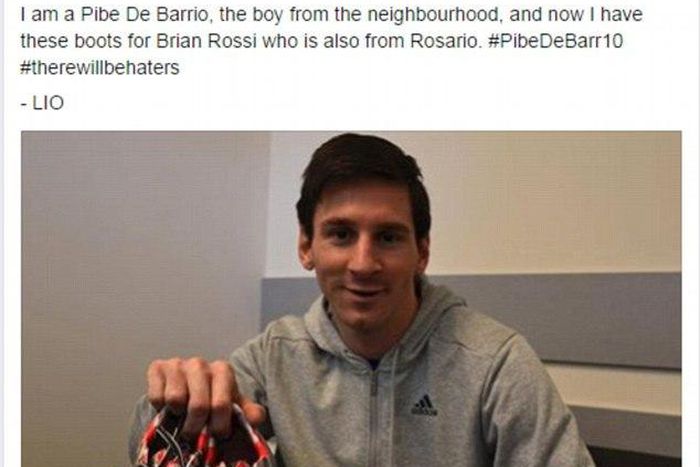 Brian Rossi gift was revealed via a message that reads; "I am a Pibe De Barrio, the boy from the neighbourhood, and now I have these boots for Brian Rossi who is also from Rosario. #PibeDeBarr10 #therewillbehaters," Messi writes alongside a picture of him holding the boots.