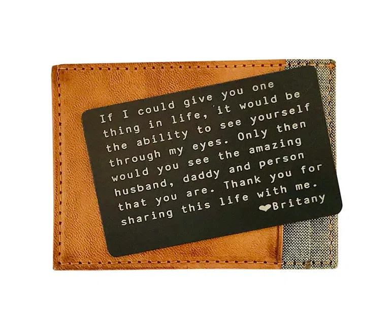 For something sleek and sentimental, get a tiny metal card engraved with a heartfelt message (up to 150 characters). It’s small enough to fit in a wallet, so they’ll always have a piece of you close by.