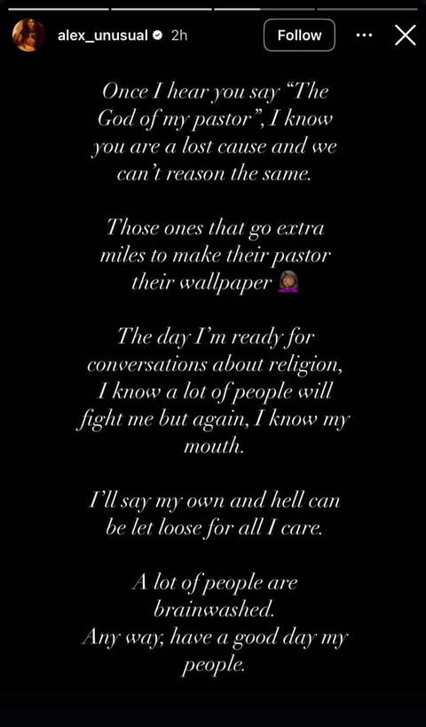 BBNaija's Alex Unusual is not having it with soem people who have their pastors as their wallpapers