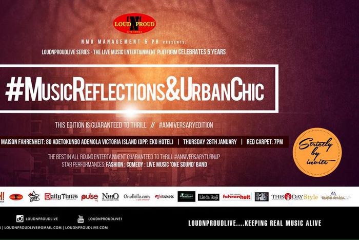 NMO Management & PR presents LoudNProudLive Series the live music entertainment platform. This edition tagged MusicReflections&UrbanChic will be celebrating 5 Years of great all round entertainment. it is guaranteed to be a fun filled night with Star performances: Fashion : Comedy : Live music 'One Sound' Band.