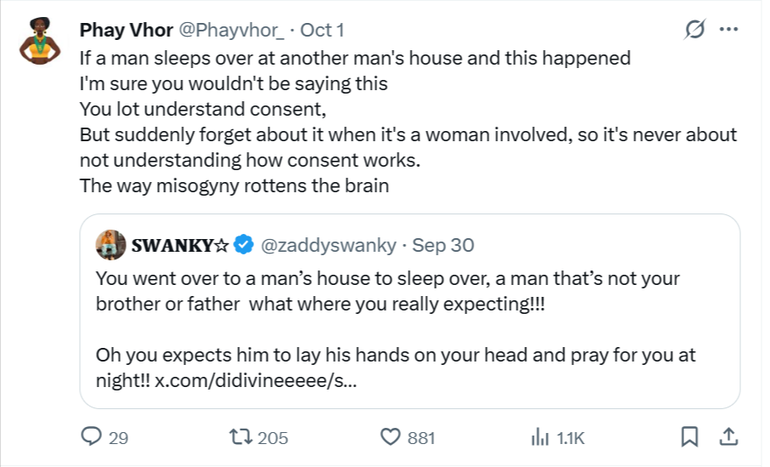 One of the most troubling aspects of the viral debate is the victim-blaming that followed. Too many Nigerians were quick to ask: “Why did she sleep over if she didn't want anything to happen?”, “Why didn’t she leave?”