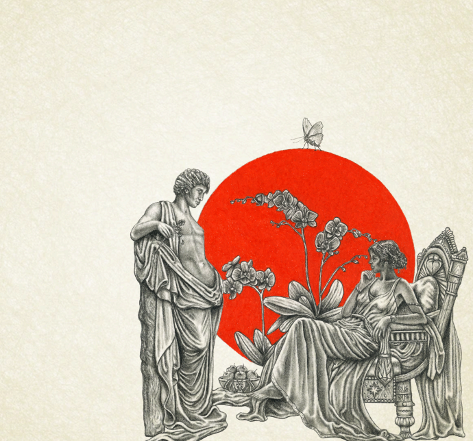 Surrounding them are symbols of temptation and tenderness: a bitten apple, a wilting flower, blooming orchids, and a carved heart, all representing the fragile humanity within ‘Wish U Well.’