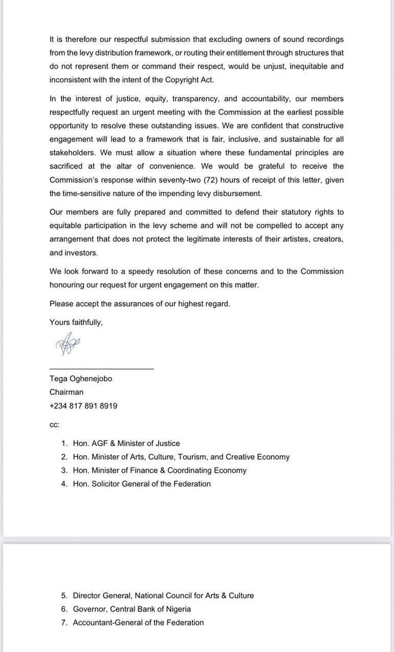 In a letter by ReLPI, signed by its president, Mavin Records CEO Tega Ogenejobo, and made available to Pulse Nigeria, the organisation claims the disbursement process fails to align with standard practice, including in the establishment of shares among the relevant classes of rights and in the distribution of levies.