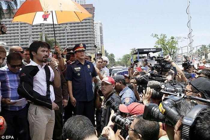 Pacquiao was lifted in an open tour bus from the airport to his home waving to cheering fans.