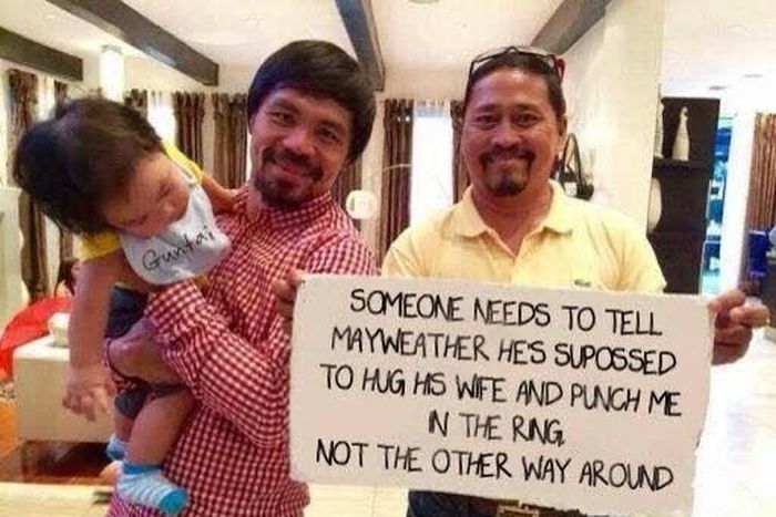 Pacquiao in a new photo is seen standing beside a man with a placard which reads; "someone needs to tell Mayweather he's supposed to hug his fight and punch me in the ring, not the other way round."