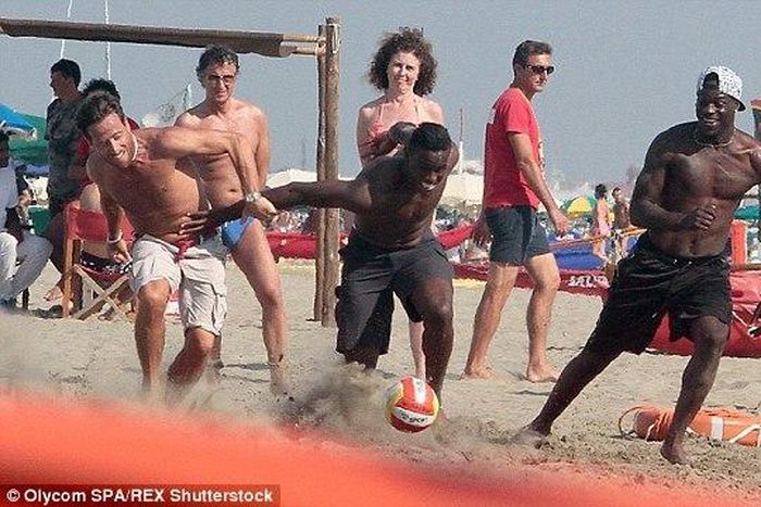 The Italian was pictured enjoying a kick-about with his friends in the beach resort of Forte del Marmi, Italy.