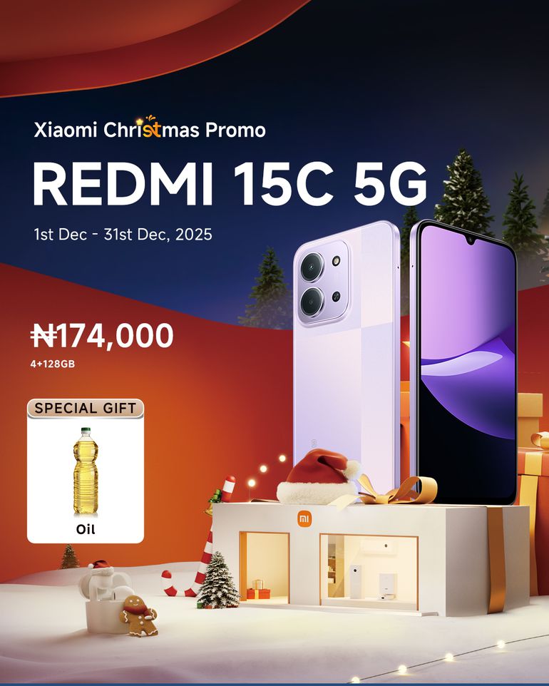 To celebrate the launch this Christmas season, Xiaomi is rolling out exclusive offers! The 4GB+128GB REDMI 15C 5G is available for a jaw-dropping price of ₦174,500 — and that’s not all! Every customer who buys the phone gets a free high-quality cooking oil.