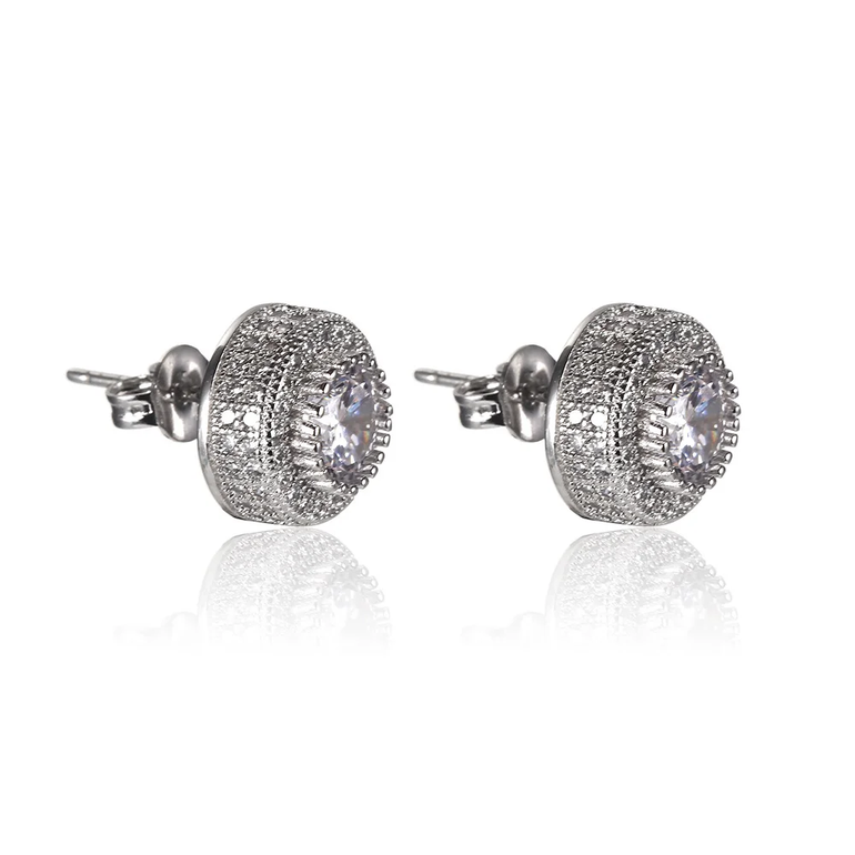 The first pick is the Doughboy Iced Dot Stud Earring. They are crafted with meticulous detail. Each earring features a radiant, clear cubic zirconia stone, 8mm in size, nestled within an exquisite crown setting.