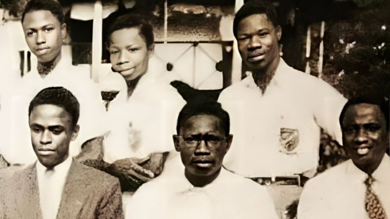 MKO Abiola (sitting center) was the editor and Olusegun Obasanjo (standing right) was the deputy editor of their school paper (Baptist Boys High School Abeokuta). [Historical Nigeria/Facebook]