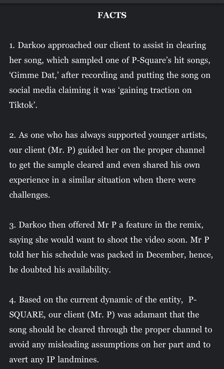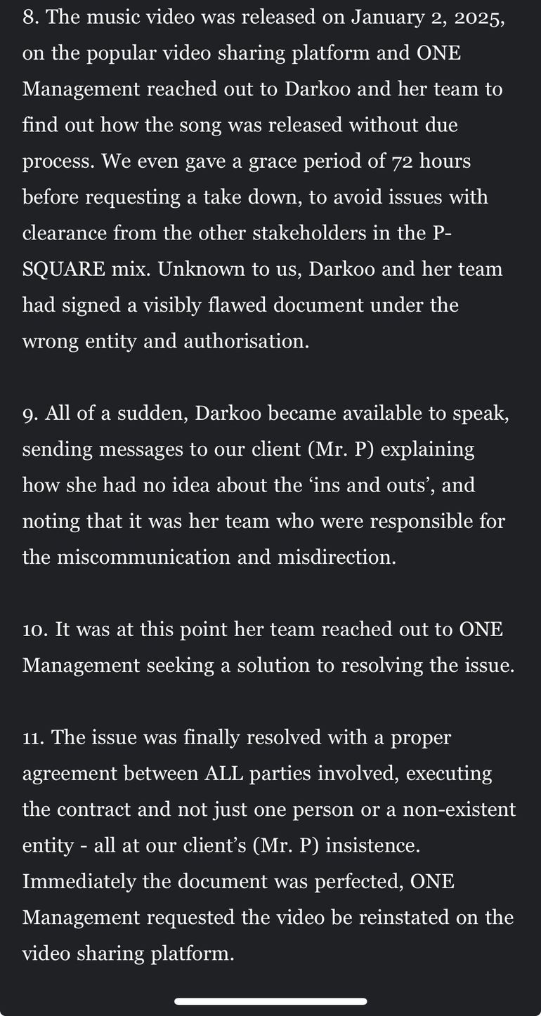 The release further revealed that Darkoo offered to have the veteran as a guest artist on the remix but contrary to her claim that Mr. P insisted on being on the original, he communicated his unavailability for the proposed video shoot.