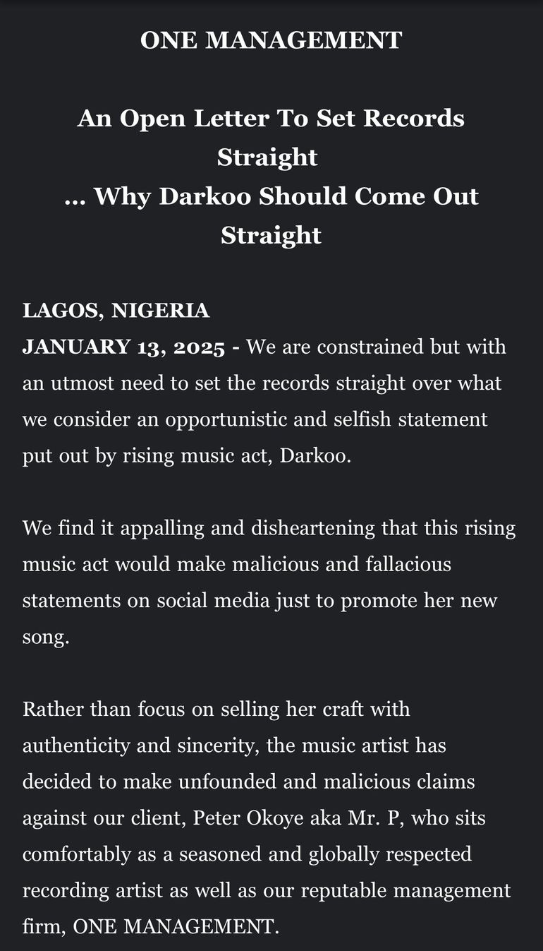 In a lengthy press release signed by Ayo Oke on behalf of One Management, the company called the claims opportunistic and selfish.