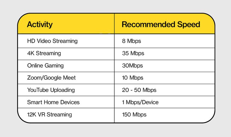 Suppose you work remotely and need to download, watch videos at high speed, or upload large videos to YouTube. In that case, you will want at least the 100Mbps package so that you do not experience delay and buffering.