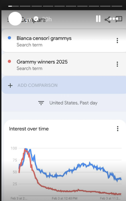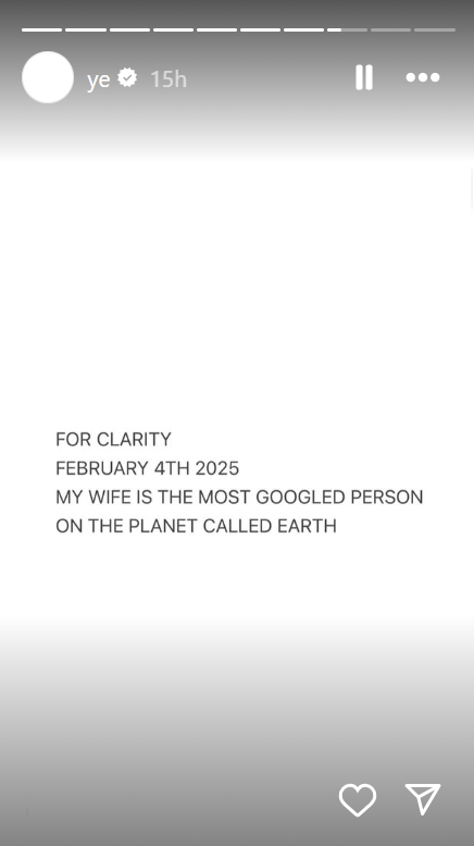 On February 4, 2025, Ye flooded his Instagram stories with posts showing the Google search trends and analytics on the day of the Grammy's, which his wife Bianca Censori headlined.