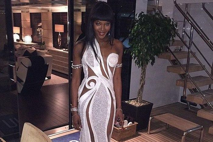 Naomi Campbell was the centre of attraction. She wore a Versace dress made of white and glittering silk with nude panels that managed to cover Ms. Campbell's modest body parts.