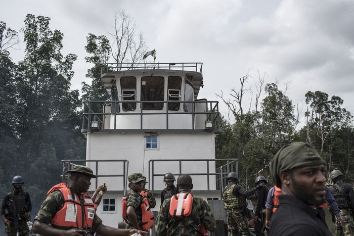 Members of the NNS Pathfinder of the Nigerian Navy patrol to look for illegal oil refineries on April 19, 2017 in the Niger Delta region near the city of Port Harcourt, Nigeria. [Getty Images]