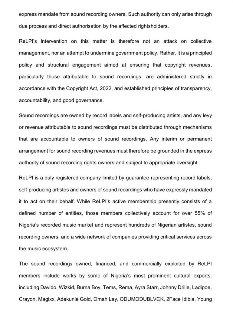 “While ReLPI’s active membership presently consists of a defined number of entities, those members collectively account for over 55% of Nigeria’s recorded music market and represent hundreds of Nigerian artistes, sound recording owners, and a wide network of companies providing critical services across the music ecosystem. The sound recordings owned, financed, and commercially exploited by ReLPI members include works by some of Nigeria’s most prominent cultural exports, including Davido, Wizkid, Burna Boy, Tems, Rema, Ayra Starr, Johnny Drille, Ladipoe, Crayon, Magixx, Adekunle Gold, Omah Lay, ODUMODUBLVCK, 2Face Idibia, Young Jonn, Blaqbonez, Candy Bleakz, Oxlade, Simi, CKay, Mayorkun, Andre Vibez, Jim Rex Lawson, Bobby Benson, Osita Osadebe, Victor Uwaifo, Celestine Ukwu, and many others.”
