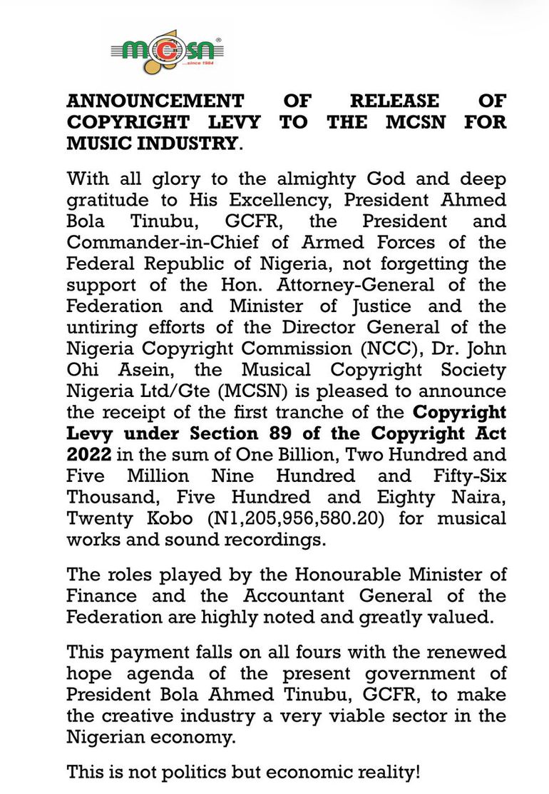 In a statement by Musical Collection Society of Nigeria (MCSN) made available to Pulse Nigeria, the society thanked President Bola Tinubu, the DG of NCC John Assien, and the Minister of Justice Lateef Fagbemi SAN on disbursement of One Billion, Two Hundred and Five Million Nine Hundred and Fifty-Six Thousand, Five Hundred and Eighty Naira, Twenty Kobo (N1,205,956,580.20) which is the first tranche of the copying levy for musical works and sound recordings as provided by Section 4 of the Copying (Levy On Material) Order 2021.