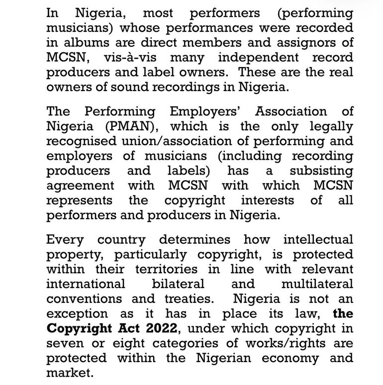The CMO also added that the Performing Musicians’ Association of Nigeria (PMAN), which is the only legally recognised union/association of performing and employers of musicians (including recording producers and labels), has a subsisting agreement with MCSN, with which MCSN represents the copyright interests of all performers and producers in Nigeria.