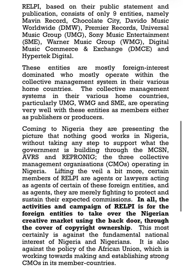 RELPI, which is made up of several record labels, including global majors Sony Music, Universal Music, and Warner Records, Mavin Records, and Chocolate City, insisted upon its right to receive the copyright levy on behalf of its members by virtue of Section 89 (3) of the Nigerian Copyrights Act 2022.