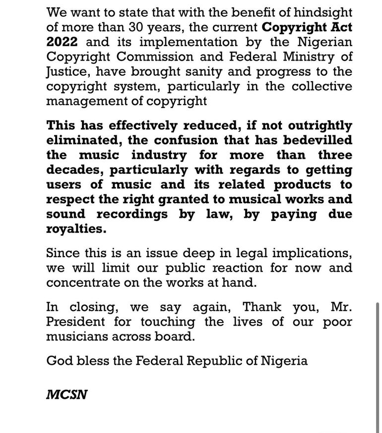 MCSN thanked the NCC and the Ministry of Justice for implementing the copyright levy and eliminating the confusion that has rocked the Nigerian music industry as it pertains to the licensing or copyright works and the payment of royalties.