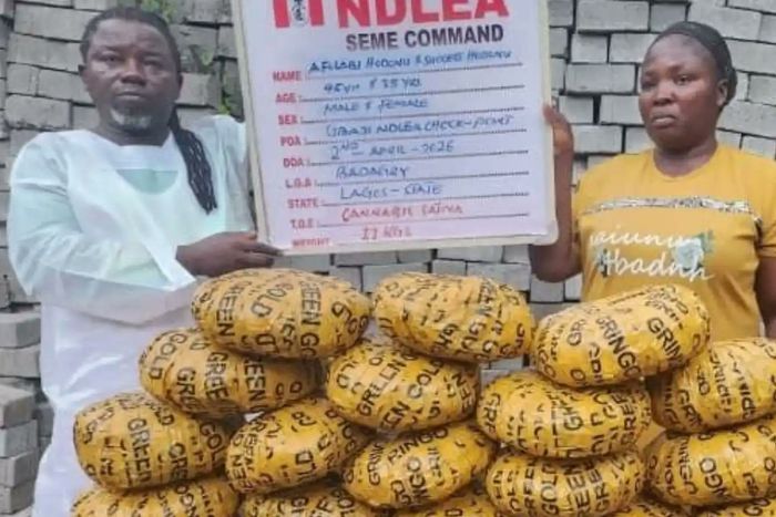 According to a statement shared by the agency's spokesperson, Femi Babafemi, on Sunday, a search of the couple's Honda Pilot SUV uncovered the illegal drug, which had been stashed away in altered parts of the vehicle.