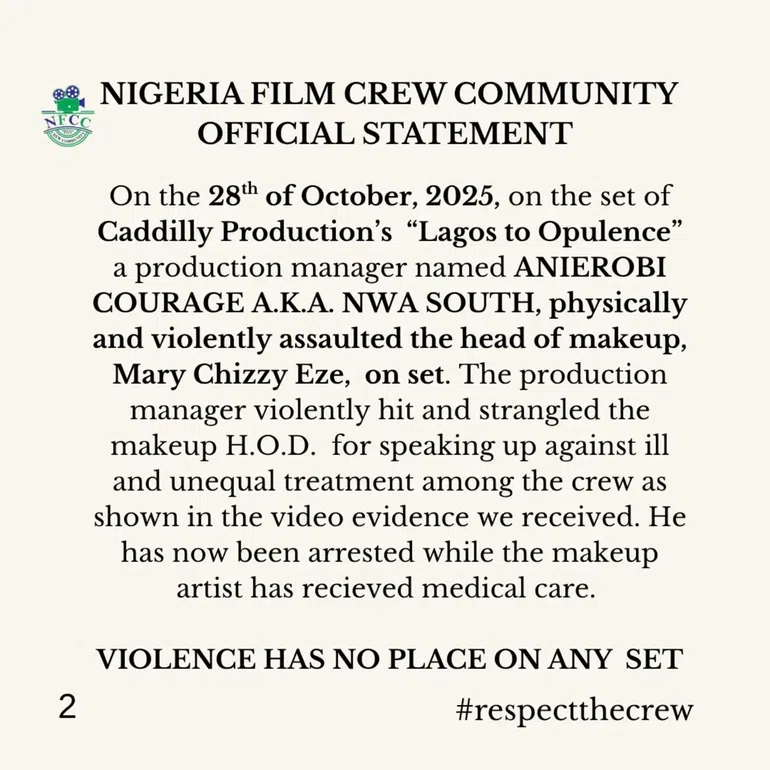 “Production Manager @anierobi.courage has been arrested for physically assaulting the Head of Makeup & Hair on set caught on video strangling her. The victim is receiving medical care. This act is unprofessional, criminal, and inexcusable. Violence has no place in our industry. Respect is not negotiable.”