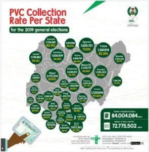 The states with the least percentage of collected PVCs compared to registered voters were Ogun with 71.36 per cent, Ekiti with 73.25 per cent and followed by Oyo with 74.17 per cent.