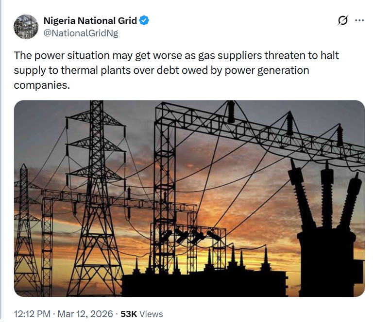 According to media reports, Nigeria's current poor supply could worsen as the gas shortage issues affecting the operation of Thermal power plants rage on. According to a post shared by the National Grid page on X, Nigerians should brace for a further blackout as gas suppliers have now halted services to power-generating companies over the rising debt.