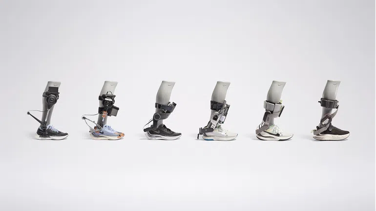 Among the innovations McCartney highlights, one stands out: Project Amplify. This concept is still far from retail shelves, but its ambition is unmistakable. The goal: a powered footwear system that helps propel the wearer forward at each step, making walking or running become augmented. Prototypes currently resemble “robot legs,” though the design is evolving.