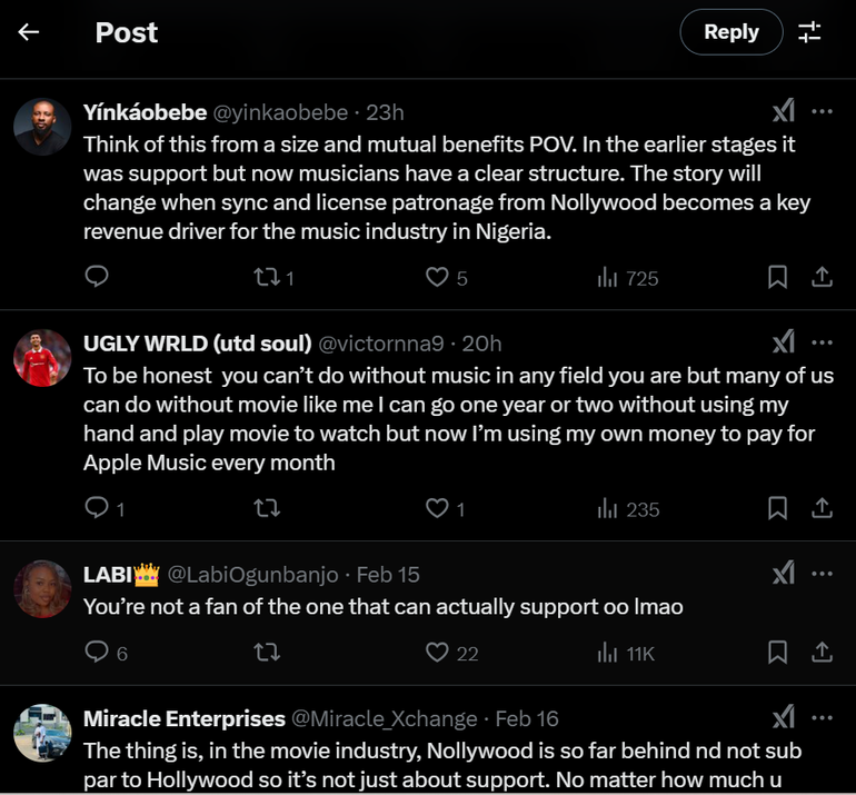 Other users echoed this sentiment, stating that musicians don’t even fully support themselves, let alone another industry. While that may be true, it doesn’t take away from the fact that Nollywood and the music industry are deeply interconnected.