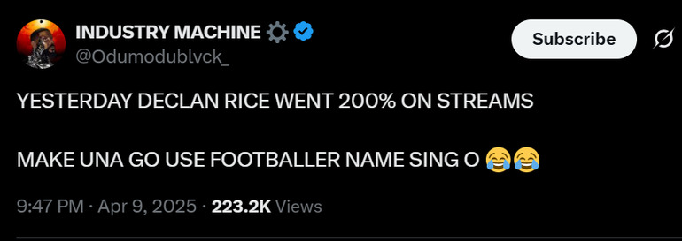 Nigerian hip hop star OdumoduBlvck shared on his X account that his hit single 'Declan Rice,' named after the Arsenal and England international, saw a 200% jump in streams following the Arsenal vs Real Madrid match.