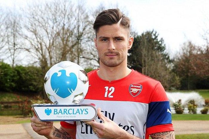 Arsenal striker Olivier Giroud has been named as the Barclays Premier League Player of the Month for March.