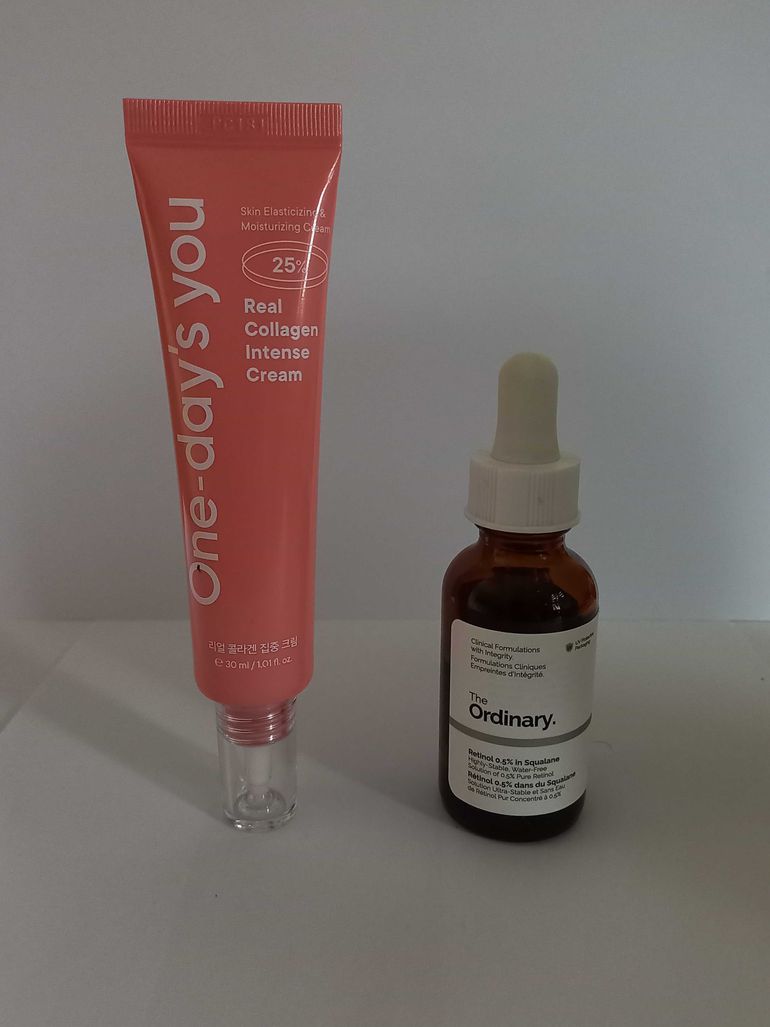 One-Day's You Real Collagen Intense Cream beside The Ordinary's Retinol 0.5% (for scale)
