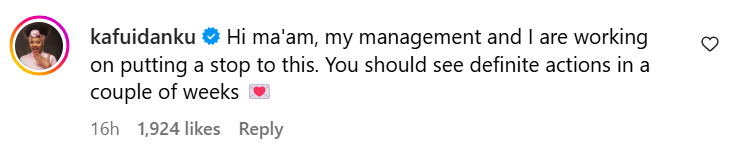 Kafui Danku, also in the comment section of the same post, told the actress that she is working alongside her management to put an end to the unauthorized broadcast of her movies in Ghana.